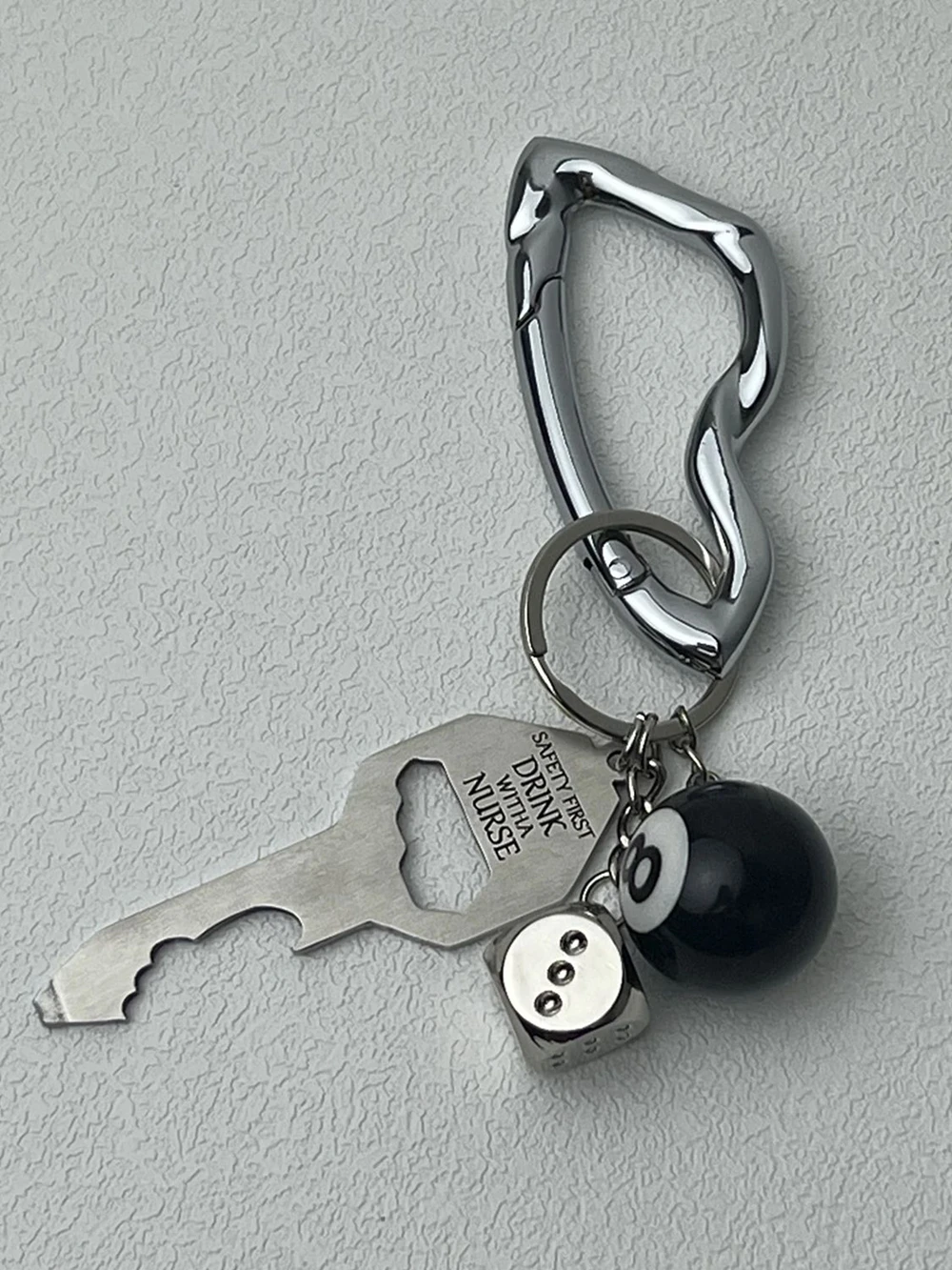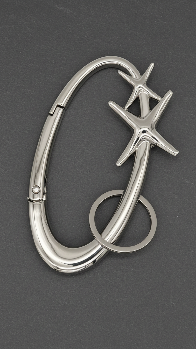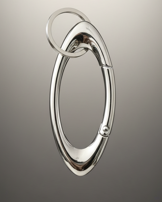 Ce porte-clés mousqueton en métal argenté séduit par son design contemporain et audacieux. Sa forme ovale épurée est sublimée par des détails sculptés en relief, apportant une touche graphique et originale. Robuste et fonctionnel, il est doté d’un anneau solide pour sécuriser vos clés au quotidien. Inspiré d’un esprit minimaliste aux accents modernes, cet accessoire allie praticité et style, parfait pour compléter une allure affirmée jusque dans les moindres détails.